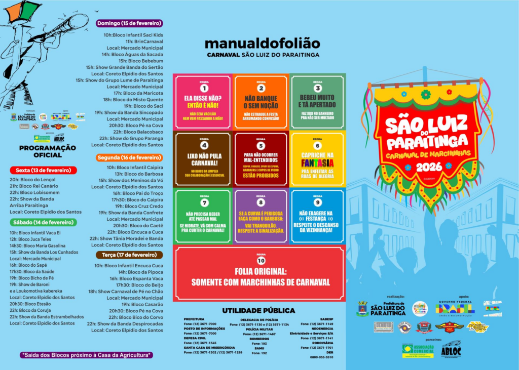 São Luiz do Paraitinga divulga programação completa do Carnaval 2026 de 13 a 17/02.