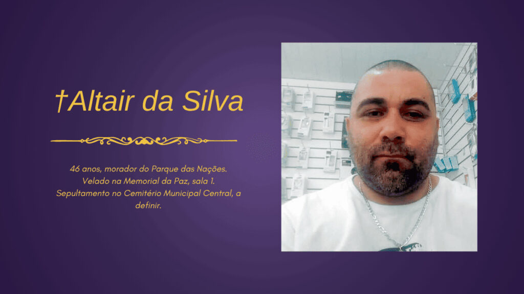 “O Portal Vale em Ação manifesta seus profundos sentimentos e solidariedade às famílias enlutadas neste momento de dor.” † Notas de falecimento em Pindamonhangaba †Altair da Silva46 anos, morador do Parque das Nações.Velado na Memorial da Paz, sala 1.Sepultamento no Cemitério Municipal Central, a definir. As notas de falecimentos em Pindamonhangaba podem receber novas atualizações ao longo do dia, conforme informações são divulgadas por funerárias e familiares.
